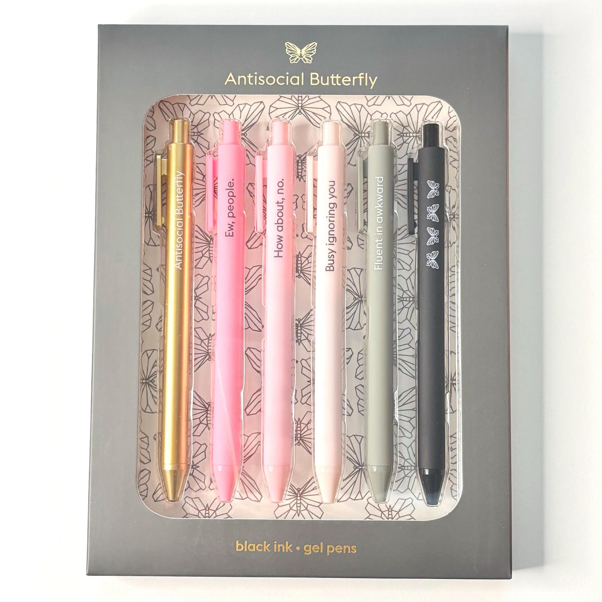 The Antisocial Butterfly 6pc Gel Pen Set features witty sayings, soft touch barrels and black gel ink.