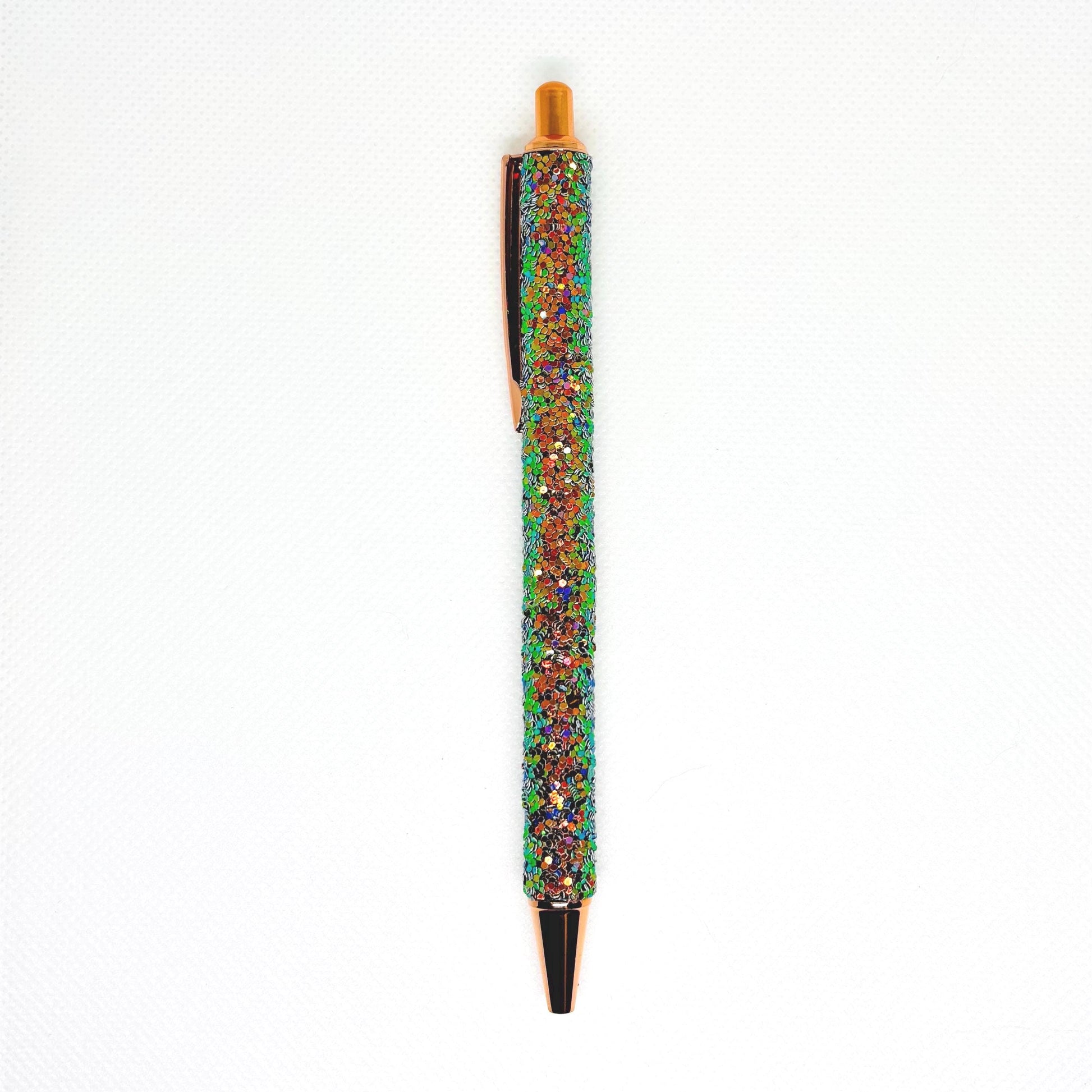 Chunky Glitter Ballpoint Writing Pens feature a rose gold barrel, click button retraction, pocket clip and are coated in sparkling, colorful glitter.