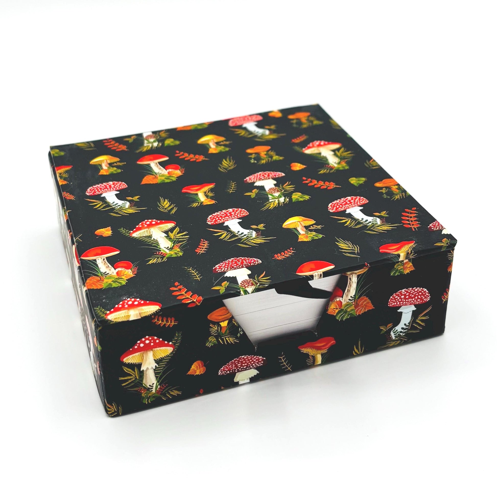 Capture all your thoughts with this mushroom-themed memo sheet set. The Mushrooms Desk Notes features a charming, woodland design with vibrant mushrooms, leaves, and ferns against a black background with gold foil and glossy accents.