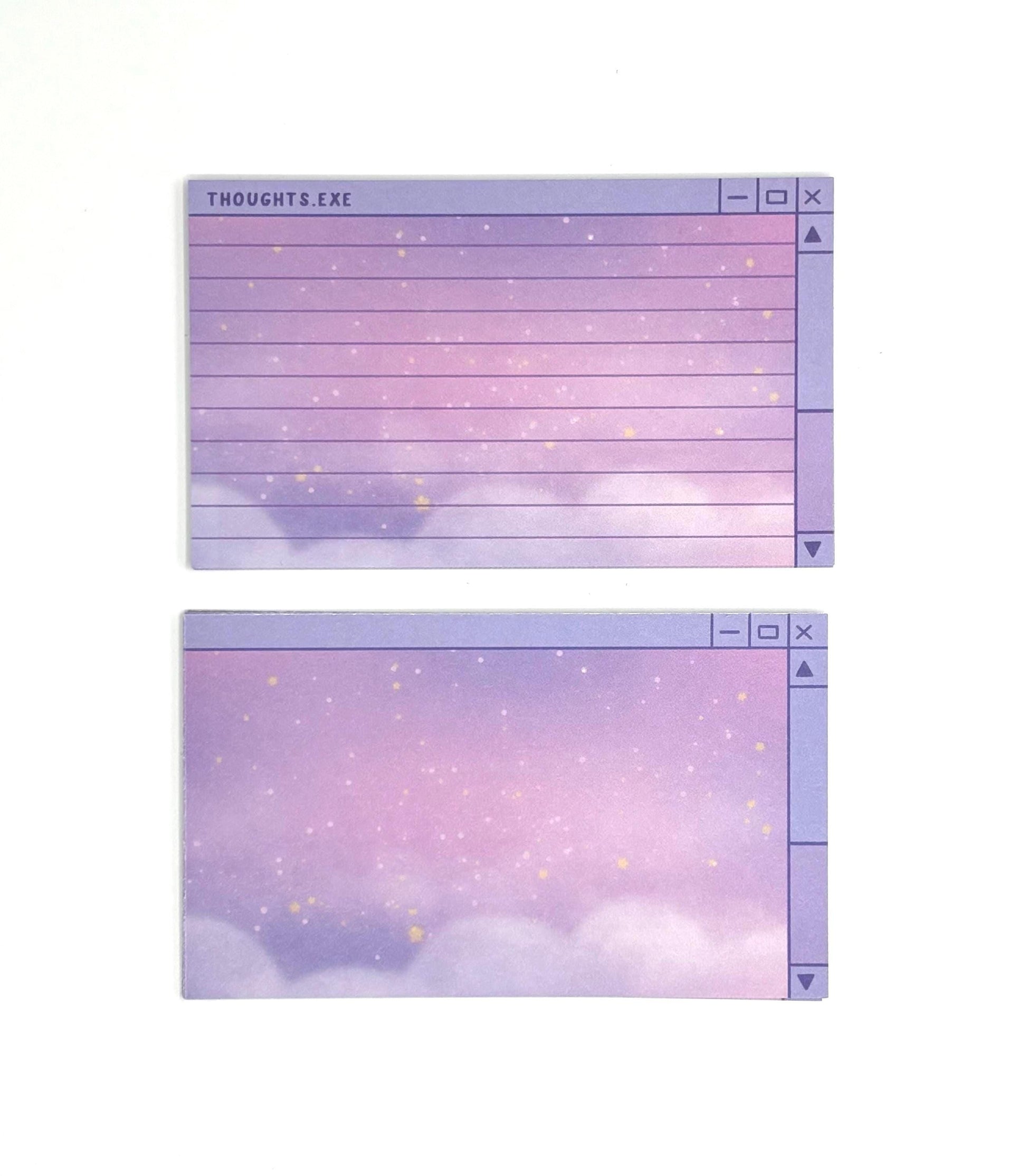 Thoughts.exe Index Cards are perfect for studying, notetaking, to-do lists, and handwritten love notes. One side is unlined and the other side is lined, each with a purple galaxy background and Y2K windows tab