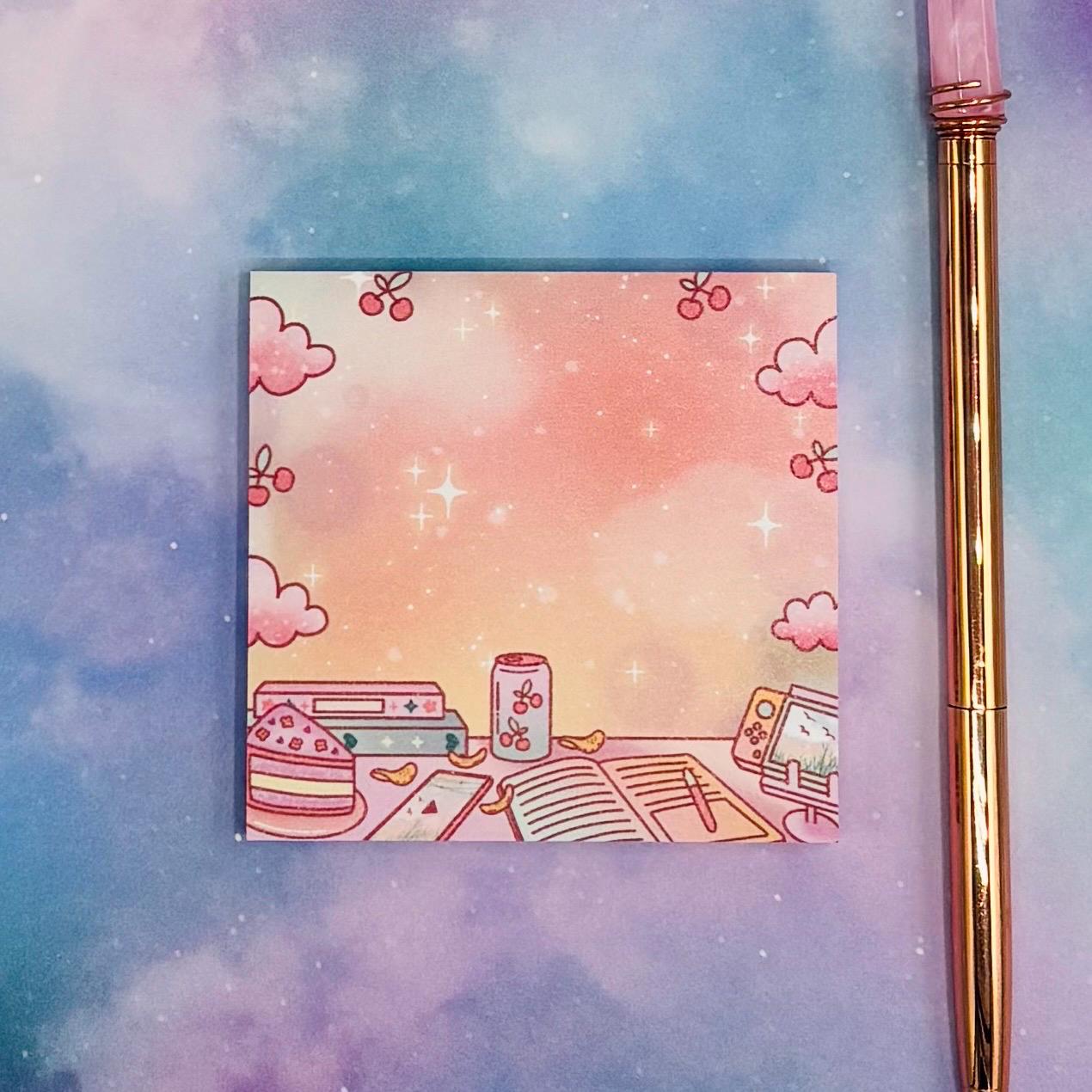 These premium sticky notes features a cute kawaii cherry themed desk scene and a peachy sunset background.