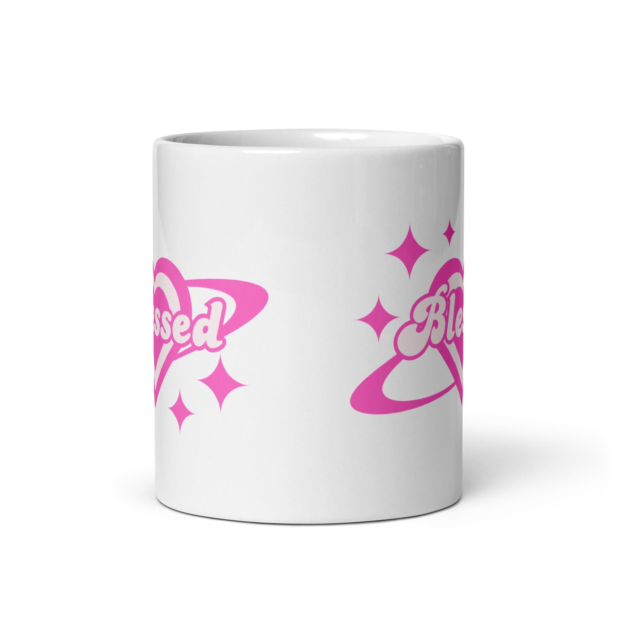 The Blessed Babe Mug features a vivid sublimation print, sturdy C-handle, and glossy ceramic. Original graphic art by Lindsey Larrimore. Made to order in Chicago, USA.